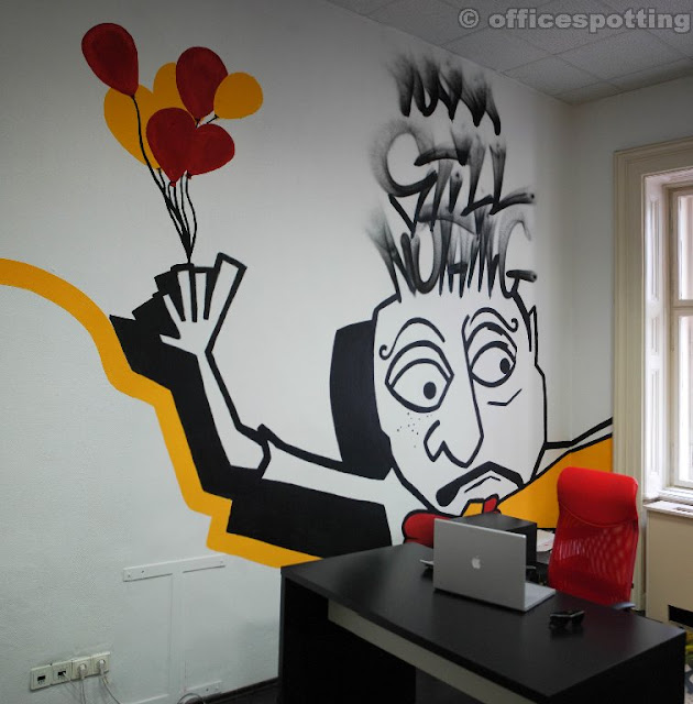 The basic concept was for the employees not to have to stare at white walls at work, and so they asked a graffiti artist from Pécs called Zina to bring some yellow and black paint, and create a more lively atmosphere. He then took a projector, projected some of his art onto the walls, and commenced to paint over them.